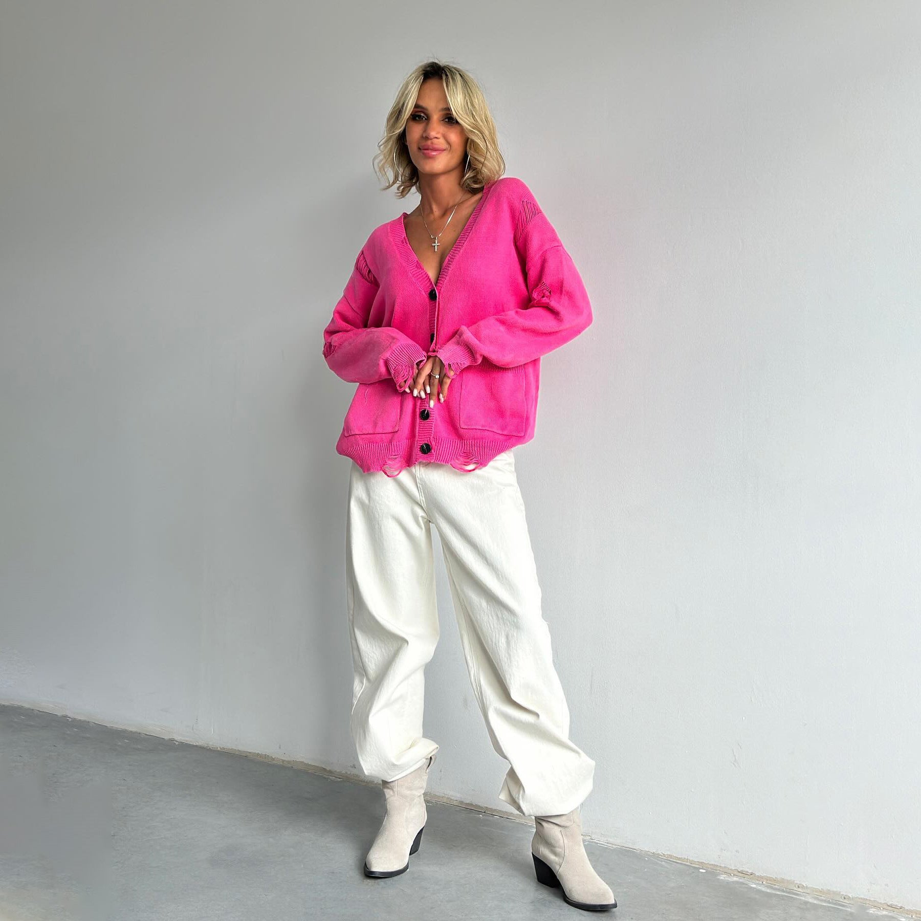 Keywords: distressed knit cardigan, vintage washed sweater, women’s street style cardigan, retro button sweater, loose knit jacket, American vintage cardigan