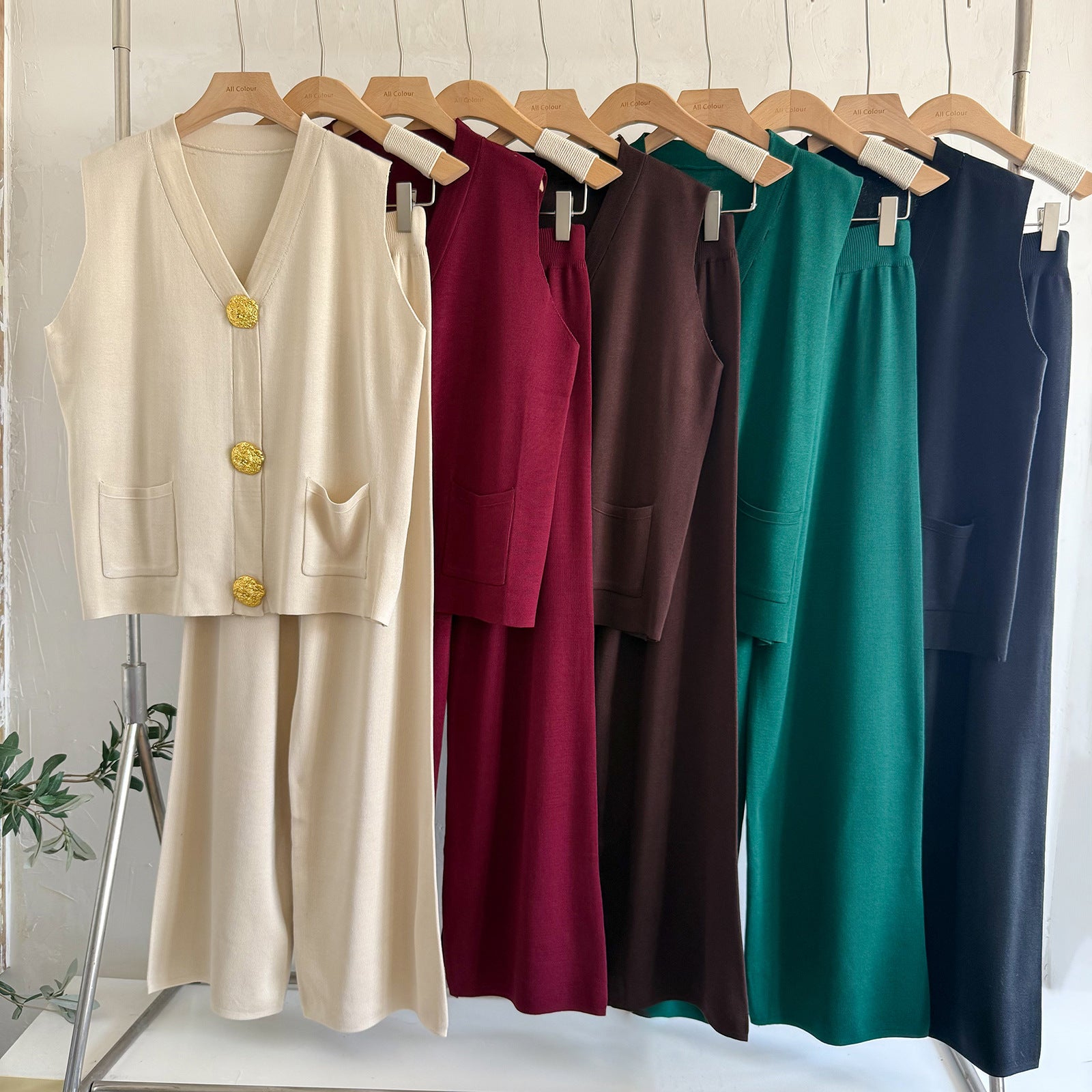 Elevate your style with this women’s gold button V-neck knit two-piece set. Featuring a chic V-neck sweater with gold buttons and matching loose knit pants, this set combines comfort with elegance. The soft, breathable knit fabric makes it perfect for year-round wear, while the relaxed fit ensures effortless styling. Ideal for casual outings, work, or home, this women’s knit two-piece outfit is a versatile addition to your wardrobe.
